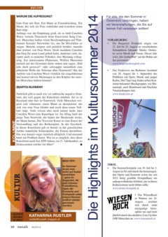 / KUNST rustler@mosaik-magazin.at 1000 Menschen an. www.wiesenrock.at Atmosphäre gespielt. www.styriarte.com Festspiele, Mengen begeistern. www.ofs.at